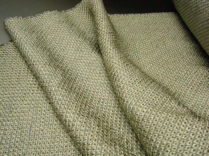 この反物は紋意匠地紋入りの白生地を使用し色指定をして染め上げてあり、絞りは一列に48個の四つ巻き絞りを総数約18万粒入れてあります。